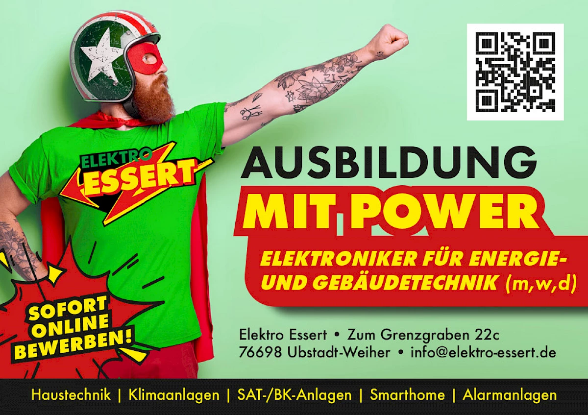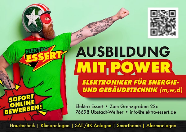 Elektro Essert mit Sitz in Ubstadt-Weiher sucht Talente, die in einem jungen und dynamischen Team ihre Karriere starten möchten. Zu den Leistungen des 1976 gegründeten Meisterbetriebs gehört die gesamte Haustechnik, einschließlich Klimaanlage, Videoüberwachung und Alarmanlage. Die Auszubildenden arbeiten dabei im Team mit erfahrenen Fachkräften, sodass beste Voraussetzungen für die berufliche Entwicklung garantiert sind.